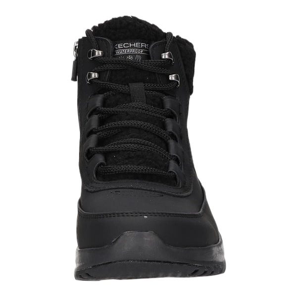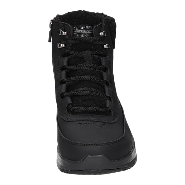 Die geringe Schafthöhe ist auch immer ein modisches Highlight. Mit diesem wasserabweisendem Obermaterial bestehend aus schwarzem glattem Kunstleder liegen Sie voll im Trend! Das Futtermaterial besteht aus einem kurzen Kunstfell. Die Laufsohle besteht aus Synthetik. Skechers Air Cooled GOGA MAT® Technologie ist eine Einlegesohle die für einen angenehm kühlen Tragekomfort sorgt. SkechersULTRA GO® Max Cushioning für einen maximal Schaumstoff gepolsterten Tragekomfort