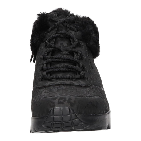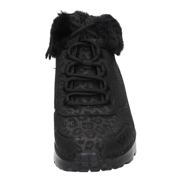 Die geringe Schafthöhe ist auch immer ein modisches Highlight. Gefertigt aus wunderschönem schwarzem glattem Kunstleder. Das Futtermaterial besteht aus einem langen Kunstfell und Textil. Die sportliche Laufsohle besticht durch einen kleinen Keilabsatz. SkechersAir-Cooled Memory Foam® Innensohle bietet ein angenehmes Fußklima. Der Schuh kann bei niedrigen Temperaturen gewaschen werden.